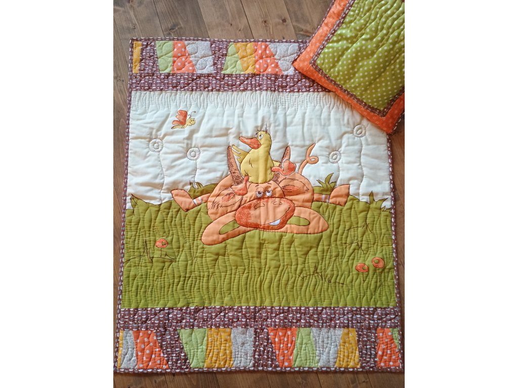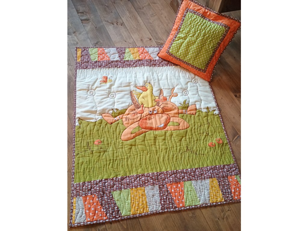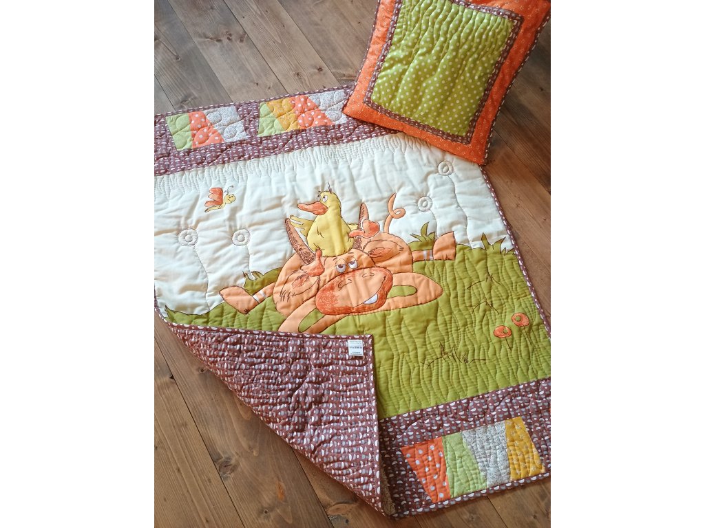 Rozveselte detskú izbičku touto krásnou originálnou dekou s vankúšom šitou ručne pomocou techniky Patchwork.