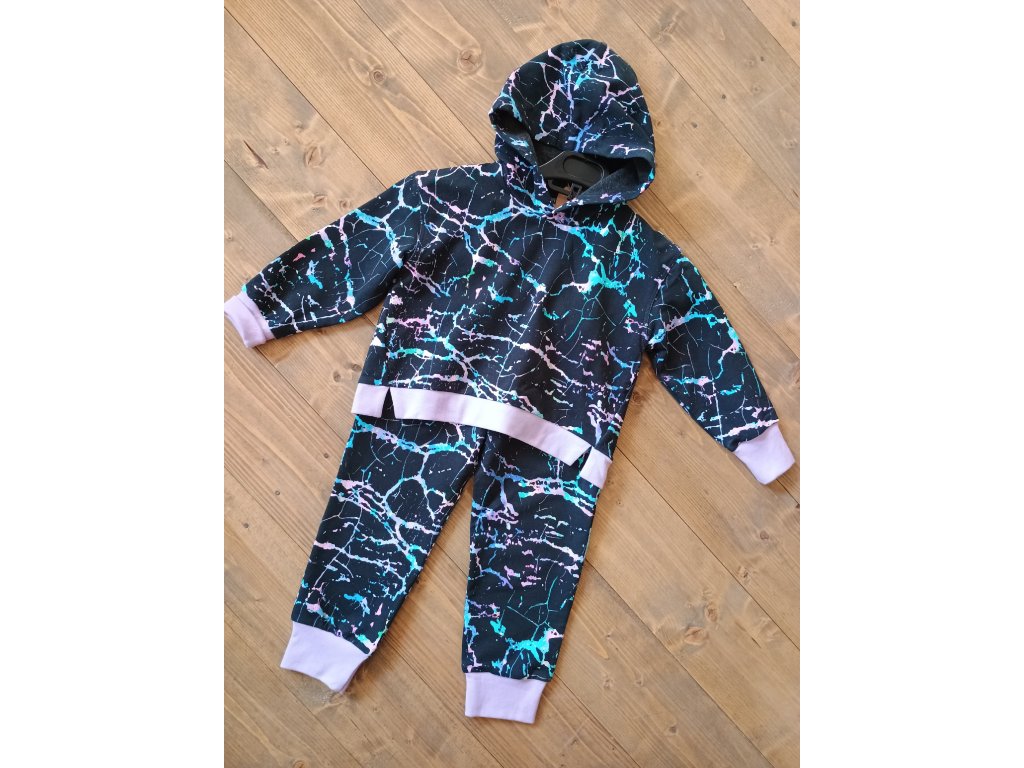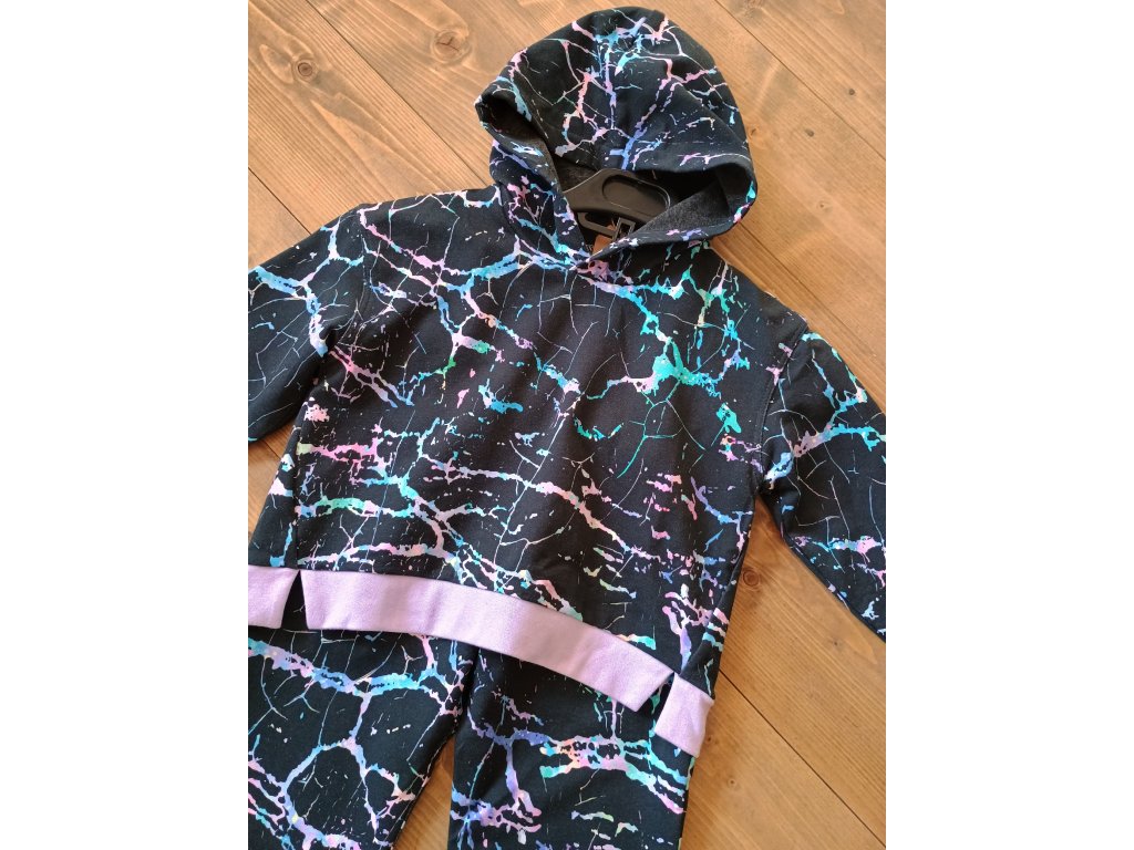 Súprava z veľmi príjemnej teplákoviny vo veľkosti 104. Vrchný diel crop Top s dlhými rukávmi a tepláky s gumičkou v páse.