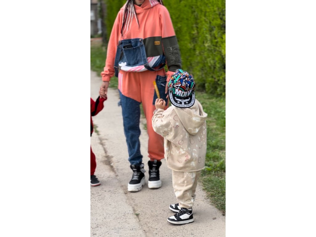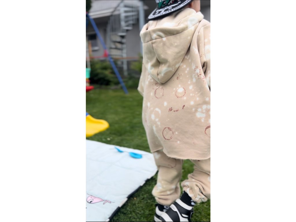 Štýlové tepláky z počesanej teplákoviny. Vzor látky je vytvorený vlastnou technikou pomocou SAVA a PEČIATOK.