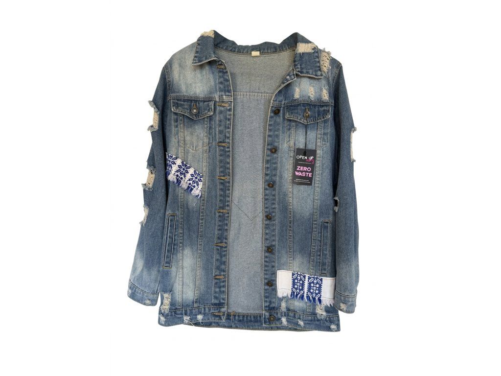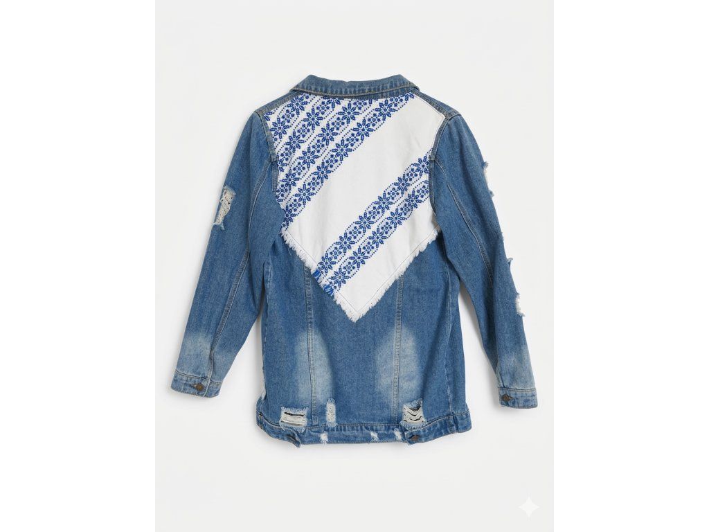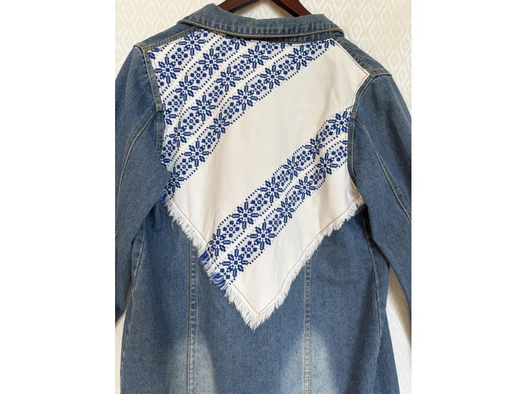 Základom je denimová bunda v krásnom stredne modrom odtieni. Dominantou celého kúsku je retro obrúsok. Na obrúsku je autentická, ručne šitá modrá krížiková výšivka s tradičnými geometrickými vzormi, ktoré upútajú na prvý pohľad.