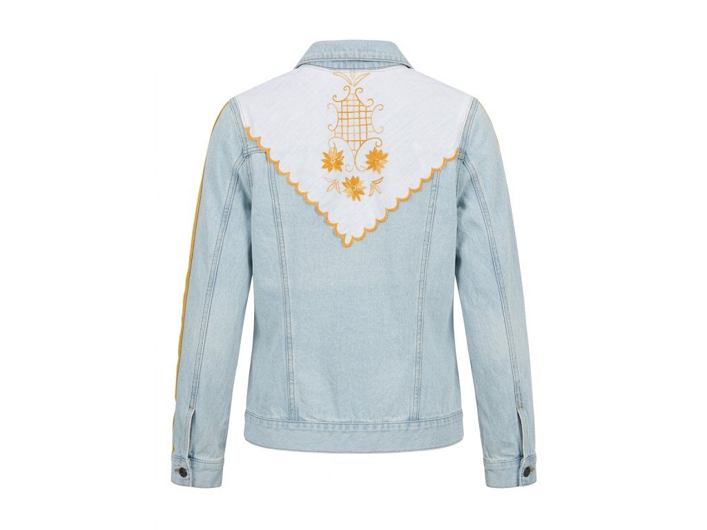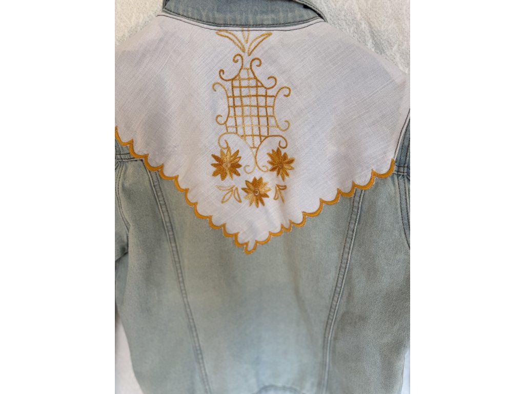 Cítite tú nostalgiu? Táto bunda spája drsnosť denimu s jemnosťou ručných prác našich starých mám. Vdýchli sme nový život klasickej svetlej rifľovke a na chrbát sme zakomponovali poklad z babkinej truhlice – krásny vintage biely obrúsok s poctivou žltou výšivkou.