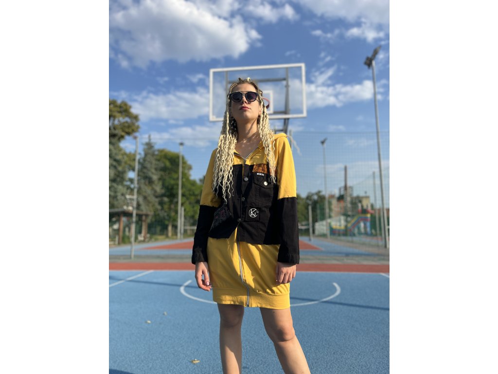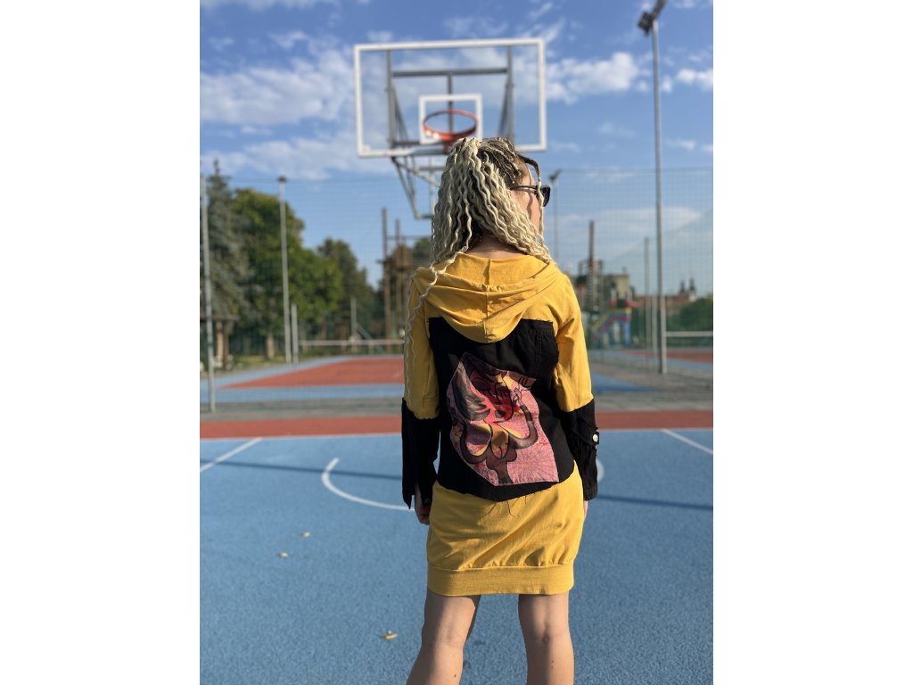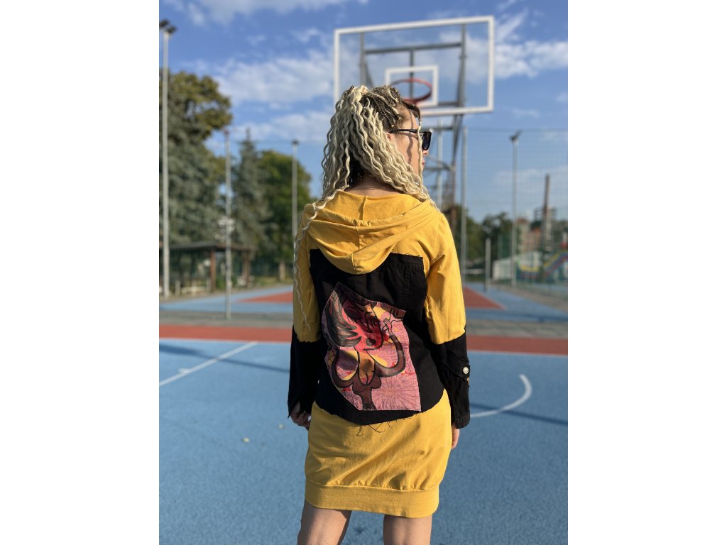 Dámska predĺžená mikina na zips – s kombináciou rifľovej bundy a nášivkou „tváre“ na zadnej strane. Vznikol tak originálny, pohodlný a štýlový kúsok, ktorý nikto iný nemá.