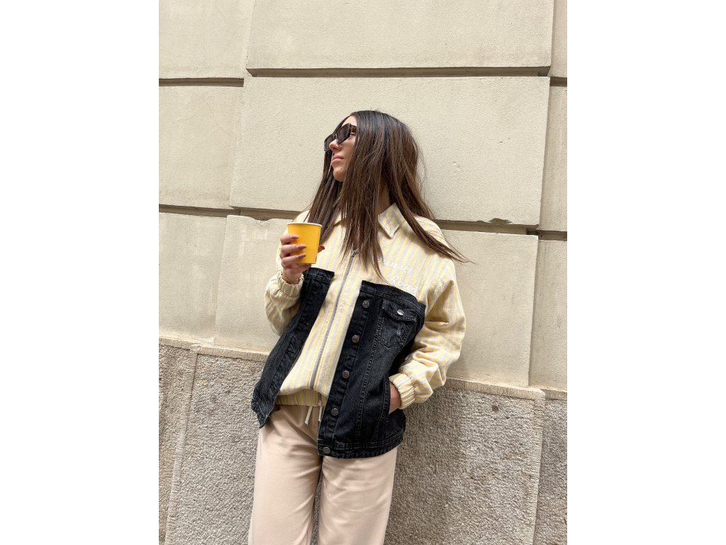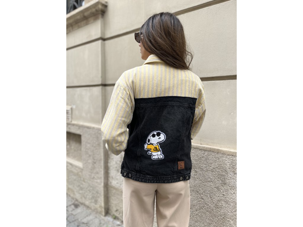 Mikina, ktorá je spojená s riflovou bundou . Na zadnej strane je nášivka Snoopy. Vznikol tak originálny, pohodlný a štýlový kúsok, ktorý kombinuje s udržateľnou módou.