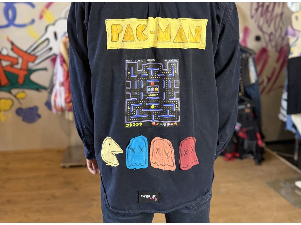 Na chrbte je použitý zvyškový materiál, na ktorý sú ručne nakreslené postavičky z detskej hry spolu s kresleným nápisom. Dopĺňa ich nažehľovačka, ktorá celý motív zjednocuje a zvýrazňuje.