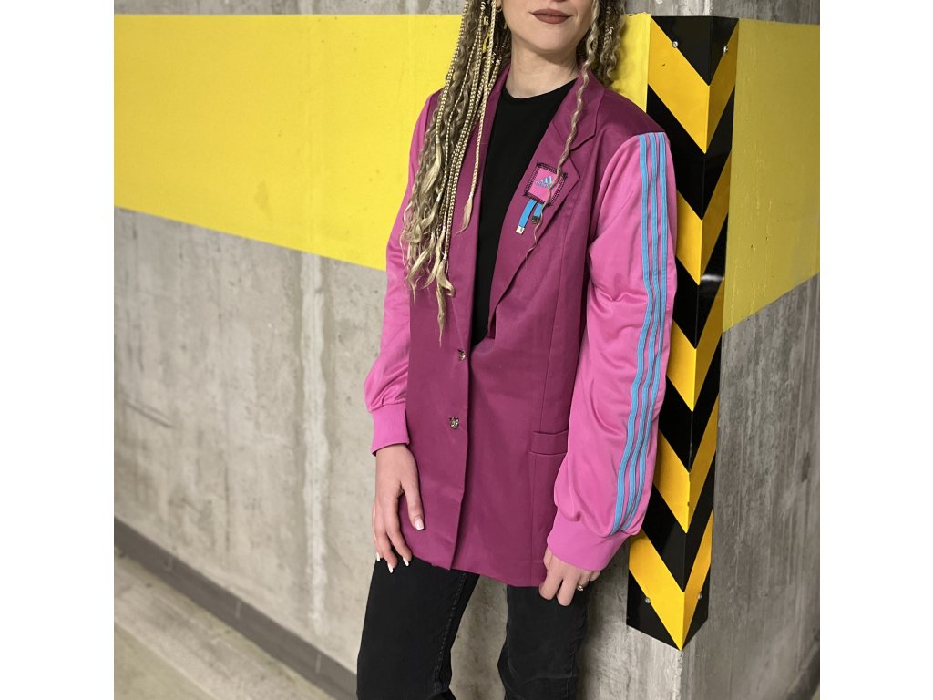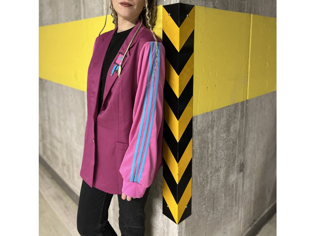 Toto pánske sako vzniklo kreatívnou upcykláciou viacerých kúskov oblečenia. Základ saka je fialový a rukávy sú použité z mikiny v ružovej farbe s modrými pásikmi, čo dodáva saku svieži a hravý charakter. Na prednej strane saka je detail so šnúrkami, ktorý pôsobí originálne a moderným dojmom.