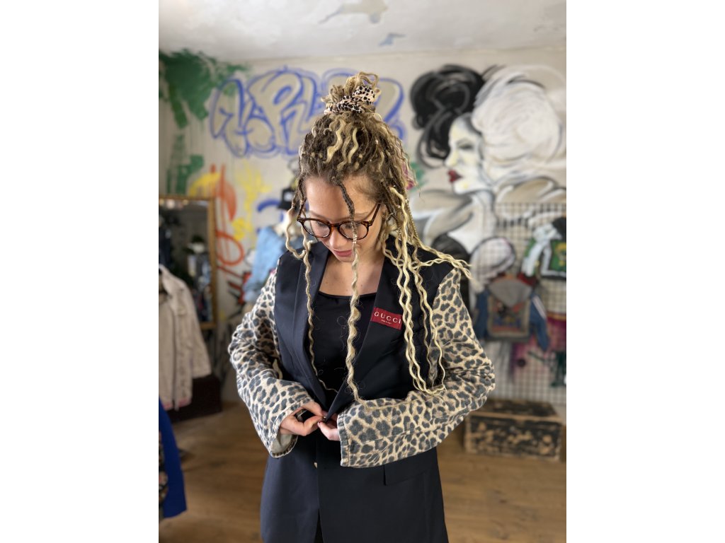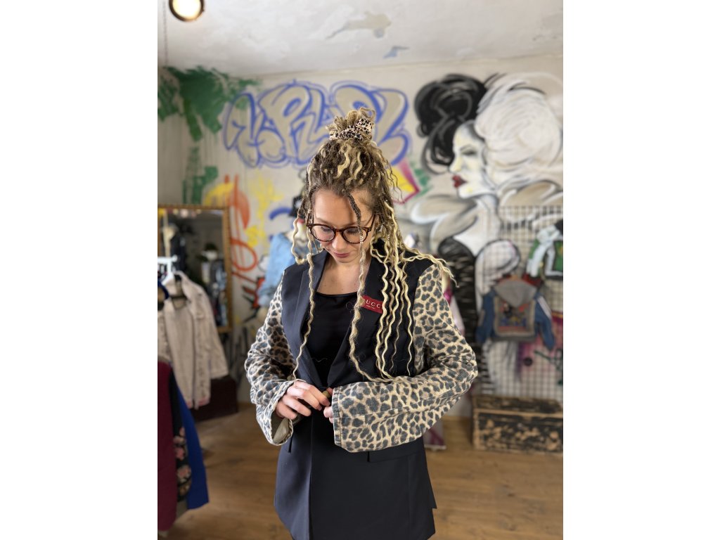 Toto pánske sako vzniklo upcykláciou pôvodného saka, ktoré som doplnila rukávmi z riflí s leopardím vzorom. Výrazné rifľové rukávy dodávajú klasickému strihu odvážny kontrast a menia ho na originálny statement kúsok.