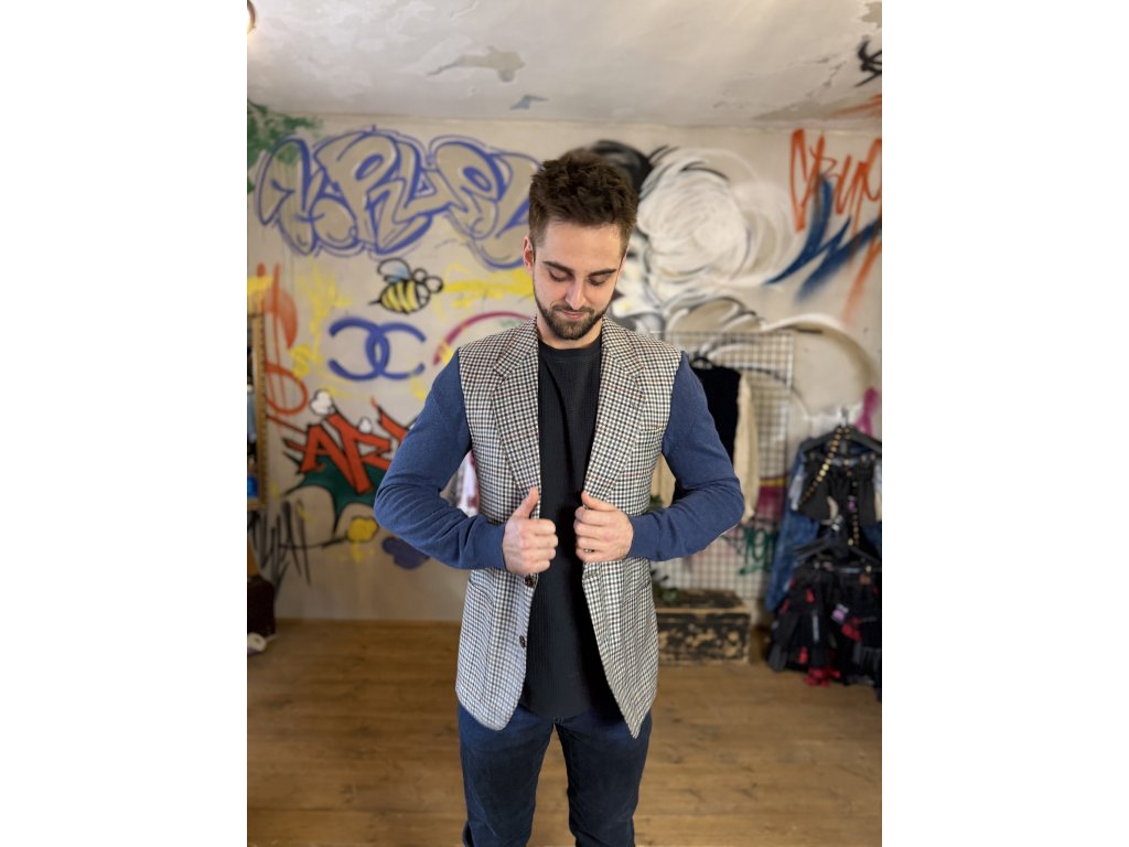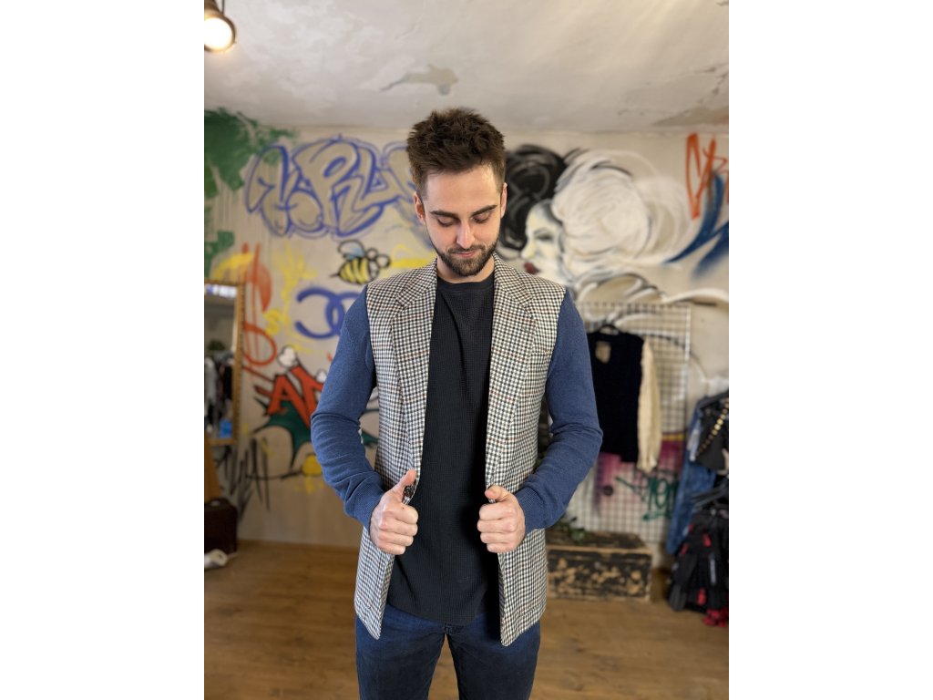 Toto sako je štýlové a jedinečné – klasický strih dopĺňajú rukávy z použitého pánskeho svetra, ktoré dodávajú kúsku textúru, pohodlie a originálny detail. Každý kúsok vznikol upcykláciou materiálov, takže je jedinečný a nesie svoj vlastný príbeh.
