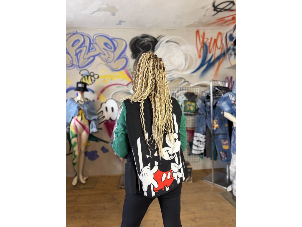 Toto pánske sako vzniklo upcykláciou viacerých kúskov oblečenia. Klasický základ saka som doplnila rukávmi z mikiny, ktoré mu dodávajú pohodlnejší, uvoľnenejší charakter. Na zadnej strane je výrazný detail – motív Mickey Mouse, pochádzajúci z letných šiat, ktorý robí z tohto kúsku hravý a originálny statement.