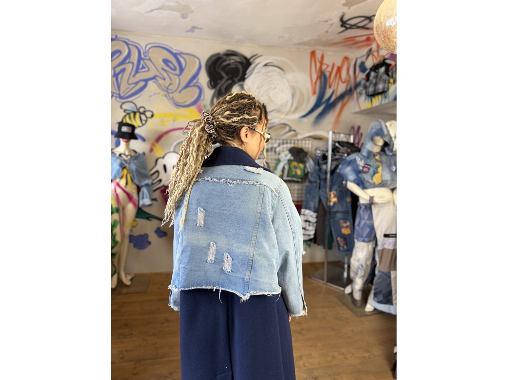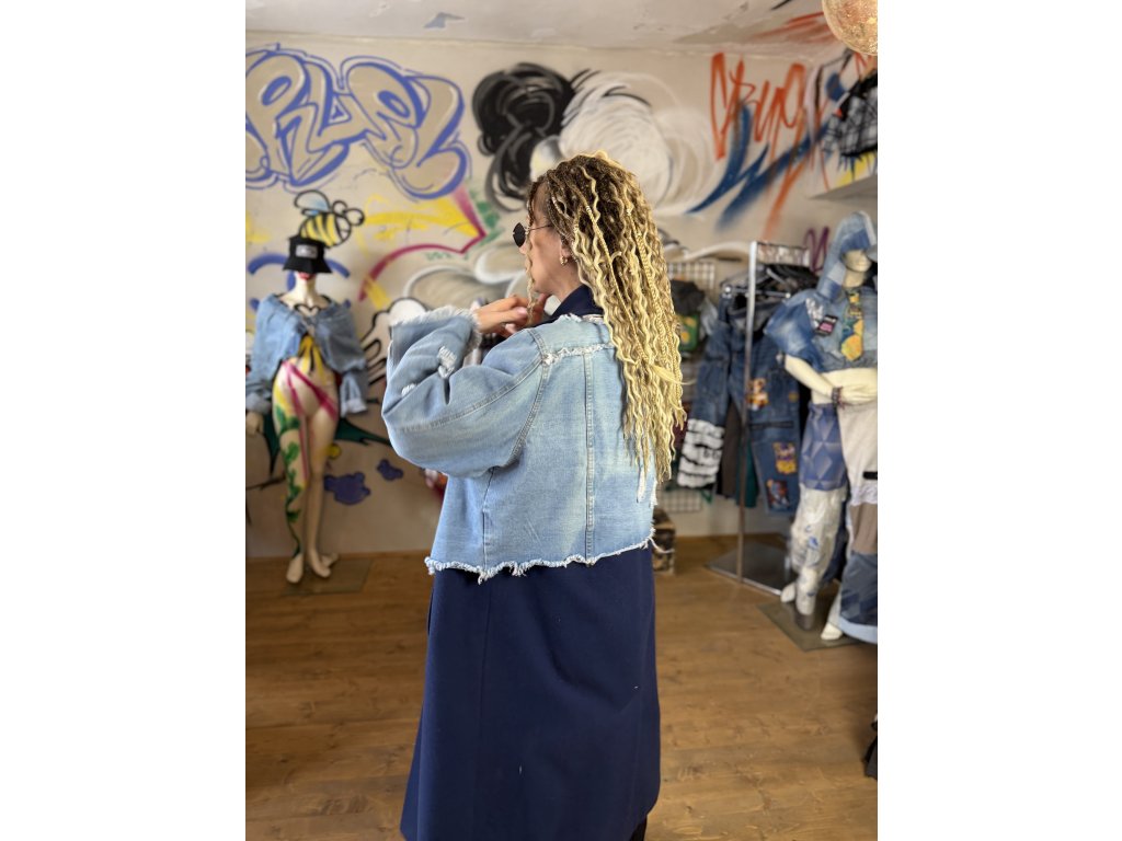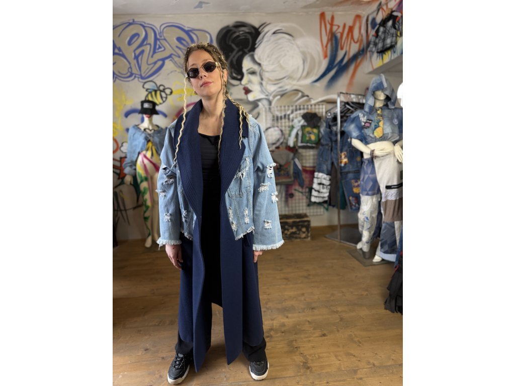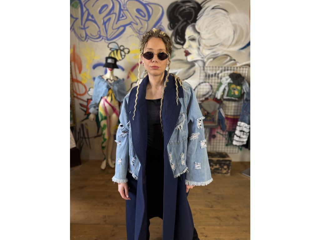 Oversize kabát premenený spojením s autentickou, dotrhanou rifľovou bundou vytvára jedinečný high-fashion kontrast. Upcyklovaný kúsok, ktorý spája udržateľnosť s luxusným street štýlom. Veľkosť XL, pri výške 168 cm siaha takmer po zem a vytvára dramatickú siluetu. Móda s charakterom, príbehom a vedomým presahom.