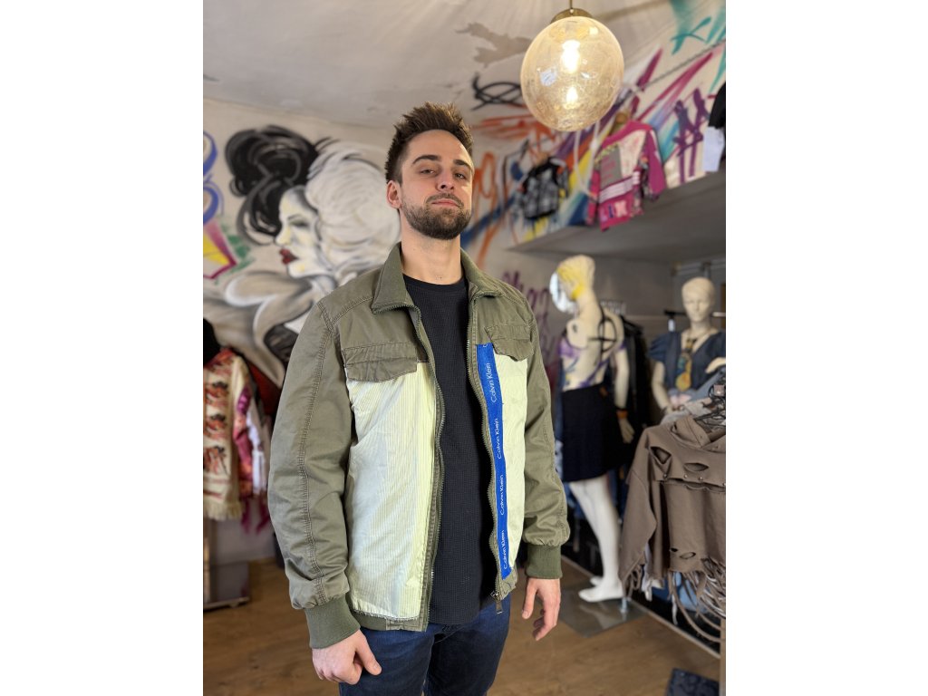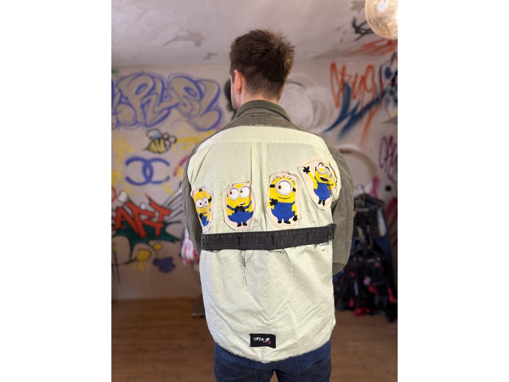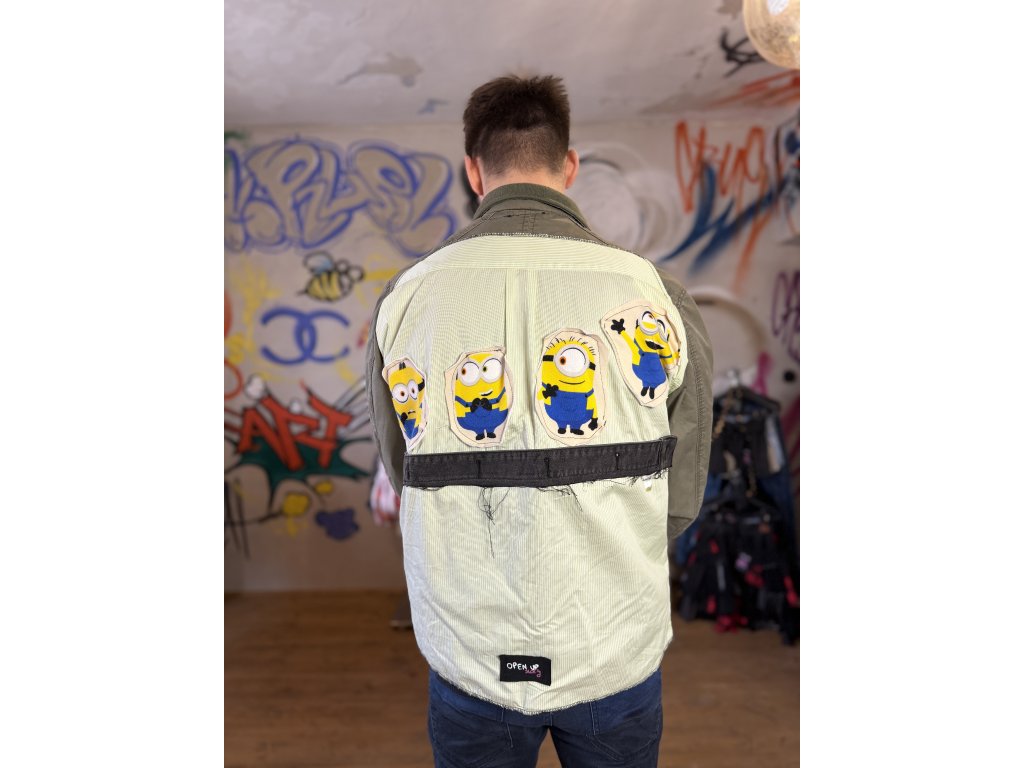 Základ tvorí kombinácia bundy a pásikavej košele, vpredu doplnená o modrý detail, ktorý celý kúsok pekne oživuje. Na zadnej strane je použitý zvyšok rifľovej látky, doplnený o nášivky – ako pripomienka toho, že aj zvyšky môžu byť hlavnou hviezdou.