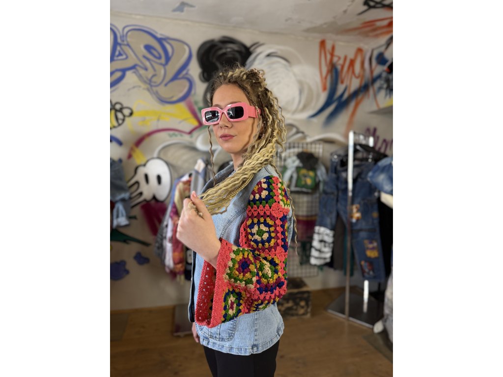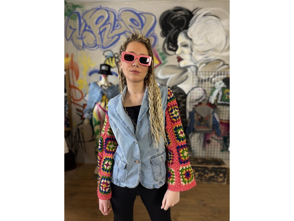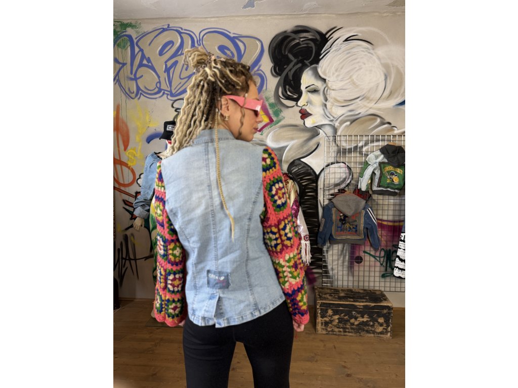 Táto rifľová vesta vznikla upcykláciou viacerých kúskov oblečenia. Základ tvorí rifľová vesta, ktorú som doplnila rukávmi zo vzorovanej vesty. Kombinácia rifľoviny a jemného kvetinového vzoru vytvára originálny kontrast a jedinečný vzhľad.