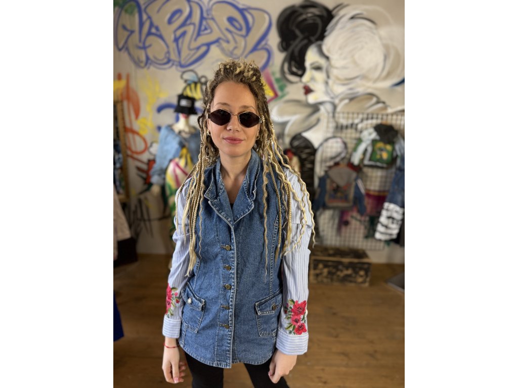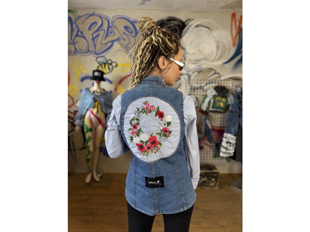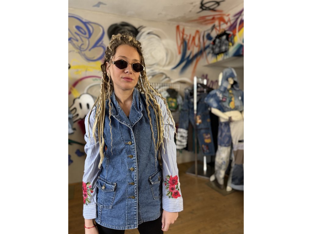 Rifľová vesta doplnená rukávmi z košele získava nový, nekonvenčný street charakter. Dominantným prvkom je kvetinový kruh na chrbte, vytvorený z košeľovej látky – detail, ktorý z tohto kúsku robí vizuálny statement. Upcyklovaná móda s umeleckým presahom, ktorá existuje len v jednom vyhotovení. Pre tých, čo sa neboja vystúpiť z davu.