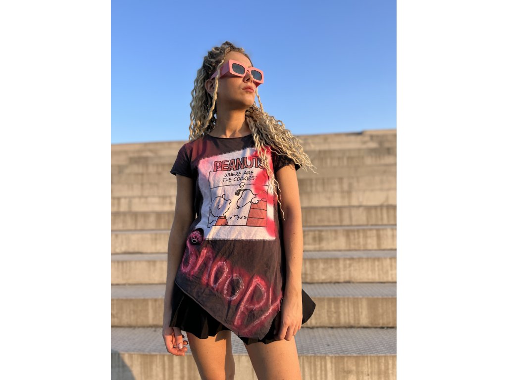 Toto dámske tričko zaujme už na prvý pohľad svojím netradičným strihom. Ako detail je použitá nášivka z detského trička, ktorá dodáva kúsku hravosť a jemný retro nádych. Povrch trička je dotvorený sprejom na textil, vďaka čomu má každý kus originálny vzhľad.