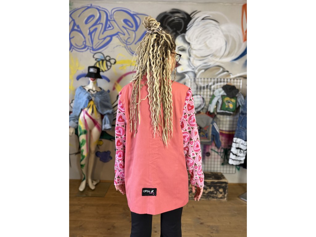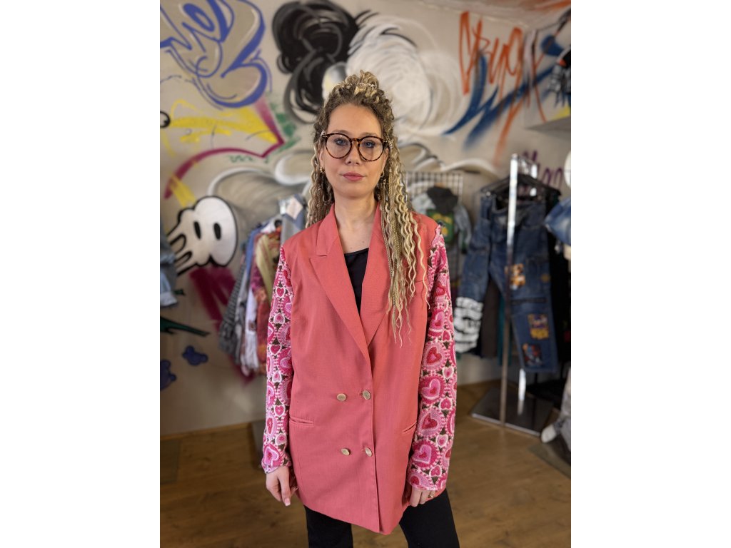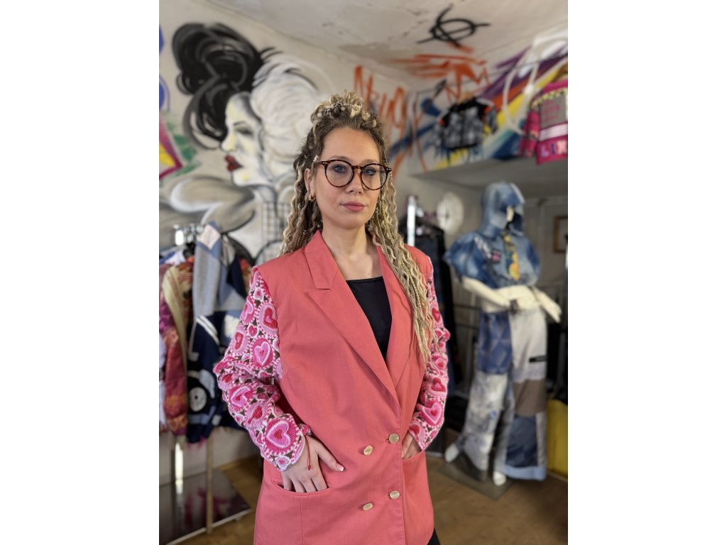 Tento dámsky kabát vznikol kreatívnou upcykláciou viacerých kúskov oblečenia a textilu. Rukávy sú použité zo srdiečkovej deky, čo dodáva kabátu hravý, pohodlný a zároveň originálny charakter. Kombinácia ružovej farby a vzorovaných rukávov vytvára jedinečný a veselý kúsok, ktorý určite zaujme.